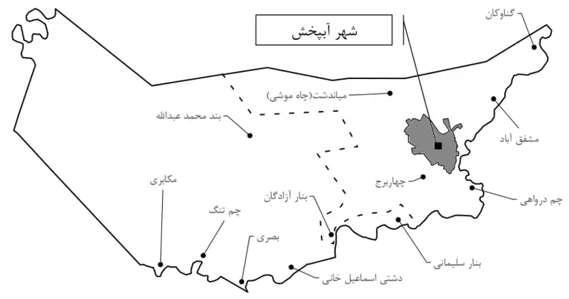 نقشهٔ دهستانهای بخش آبپخش به همراه اندازه و موقعیت شهر آبپخش (به رنگ خاکستری) در این بخش (نقشه و دادههای آن طبق دادههای آماری سال ۱۳۹۵ تهیه شدهاست):