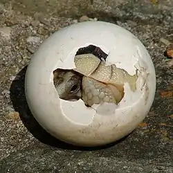 | یک بچه لاکپشت زمینی در حال بیرون آمدن از تخم مشیمهدار خود. | |