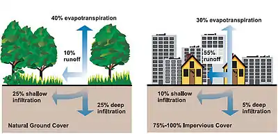 با پوشش گیاهی کمتر و سطوح غیر قابل نفوذ بیشتر (پارکینگ ، جادهها ، ساختمانها ، خاک فشرده) در مناطق توسعهیافته باران کمتری به داخل زمین نفوذ میکند و رواناب بیشتری نسبت به مناطق طبیعی به راه میافتد. از سوی دیگر جویهای آب و شبکه فاضلاب شهری رواناب را به سرعت از مناطق تجاری و مسکونی به داخل آبهای مجاور منتقل میکند. به این شکل، اندازه آب در آبراههها بسیار افزایش یافته و دبی (کمیت) آن آبراههها را بسیار افزایش میدهد که به فرسایش و جاری شدن سیل میانجامد. [1]