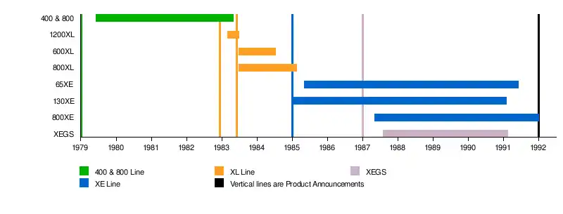 خط زمانی تولید و توقف محصولات آتاری از «Atari 8-Bit Computers F.A.Q»[54] و «Chronology of Personal Computers»[59] استخراج شدهاند.