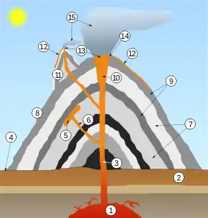 | ساختار آتشفشان: | valign="top" style="text-align:right" | ۱. اتاقک ماگما (تفتالی) ۲. سنگ بستر ۳. مجرا ۴. پایه ۵. آذرینلایه ۶. مجرای فرعی ۷. لایههای خاکستر فورانشده ۸. گُرده |