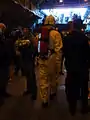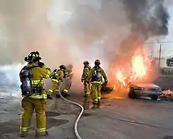 یک آتشنشان آمریکایی در حالِ تمرین در جولای 2008. او به یک شلنگ آتشپاد با نازلِ مهپاش و دستگاه کمکی تنفسی، کلاهخود و کیت کامل اطفاء حریق، مجهز است. | |