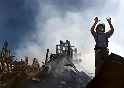 نگارهای از یک آتشنشان بر روی آوار برجهای دوقلوی مرکز تجارت جهانی که درخواست اعزام ۱۰ نفر نیرو برای کمک به آورابرداری در آن نقطه را دارد.
