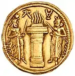 در پی سقوط اشکانیان و استقرار شاهنشاهی ساسانی، آتش مقدس به نمادی بسیار پررنگ از اقتدار ساسانیان، و همایی سهگانهٔ دهاقین، سواران جنگاور، و روحانیون در روایت رسمی قدرت از دوران تبدیل شد. نگارهٔ آتشدان و نگهبانان پیرامون آن در بسیاری از سکههای بازمانده از دوران ساسانی دیده میشود، و از آذران بهرام سه گانهٔ ایرانشهری، آذرفرنبغ[42] در پارسه، آذرگشنسپ[43] در ماد، آذرِبُرزینمِهر[44] در پارت، در جای جایِ متون پهلوی نام برده میشود. گفته شده که بنیانگذاران سلسلهی ساسانی، پیش از بنای شاهنشاهی نو، نگهبانان آتشِ اَناهید-اردشیر در اسطخر بودند. از دید بویس، فاصلهای که زمان میان ساسانیان و هخامنشیان انداخته بود، جایگاه آتشهای مقدس را به عنوان یادگارانی از دوران باستان بیش از پیش بالا برد. دوران باستانی که ساسانیان میکوشیدند خود را میراثدار و ادامهدهندهی آن معرفی کنند.
