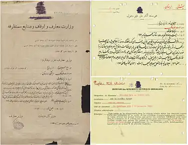 - «فهرست آثار ملی ایران». دانشنامهٔ تاریخ معماری ایرانشهر (فرهنگستان هنر). ۲۸ آبان ۱۳۹۰. بایگانیشده از اصلی در 6 اكتبر 2019. دریافتشده در 13 اكتبر 2019. تاریخ وارد شده در