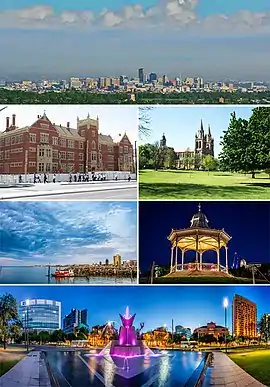 ![]() جهت عقربههای ساعت از بالا: مرکز شهر از بالای کوه لوفتی، ساختمان دانشگاه ایالتی استرالیای جنوبی از خیابان تراس شمالی، کلیسای سنت پیِر، منطقه ی ساحلی گلنگ، پارک الدر در شب و میدان ویکتوریا در عصرگاهی | |||||||||