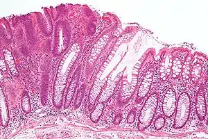 | عکس میکروگراف از آدنوم لوله ای (سمت چپ)، نوعی پولیپ کولون و پیش زمینه سرطان کولون. بافت مخاطی طبیعی در سمت راست تصویر قابل مشاهده است. | |