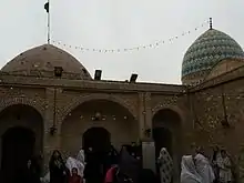 جلو سر در، دهلیزی قرار دارد که در گذشته به صورت ایوانی بوده و بخشی از حیاط اندرون بقعه بهشمار میآمدهاست. در جنوب همین دهلیز بنای مربع سنگی استواری با ابعاد ۸ر۵ متر و پوشش ضربی متعلق به قرن چهارم وجود دارد. در جنوب حرم نیز اتاق طویل مسدودی در جهت شرقی-غربی قرار دارد که احتمال دادهاند متعلق به دوره ساسانی باشد. این اتاق از مشرق به بنای مربع سنگی مذکور منتهی میگردد و معلوم میشود که در آغاز، راه ورود به بنای سنگی بودهاست. در شمال حرم، مسجد یا رواقی از دوره قاجاریه وجود دارد. صحن بزرگتر بقعه که حیاط بیرونی آن محسوب میشود در شمال همین مسجد قرار دارد. در شمال صحن اتاقی برای اقامت میهمانان متولی یا زوّار دیگر احداث شدهاست.[9]