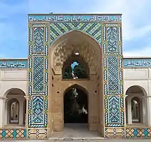 کتیبه بالای مدخل راست حرم که نام بانی و تاریخ ساخت حرم را دارد.
