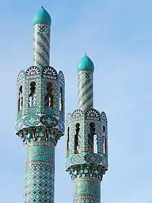 چهار مناره کاشی کاری شده در برگیرنده کتیبههای شیعی هستند. پیش از مرمت برای تزیین دور تا دور مناره هشت ضلعی از کلمه علی (ع) استفاده شده بود؛ اما کتیبههای امروزی کمی با گذشته تفاوت دارند. در بخش بالایی هر سمت از مناره کلمه «الله» دیده میشود و قسمت اول شهادتین «لا اله الا الله» در زیر آن تکرار شدهاست. کلمه «علی» نیز چهار بار به صورت الگوی در هم پیچیده نوشته شدهاست. تکرار این شیوه در دور تا دور هشت ضلعی جلوه جالب توجهی دارد. در اینجا تلفیق ستایش الله و تحسین علی (ع) را شاهد هستیم و از چیدمان کتیبه این گونه برداشت میشود که هر کس به علی ایمان بیاورد به عشق خدا میرسد.[1]