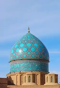 در گنبد و منارهها با مضامین دعا و تکبیر، شهادتین، اسماالله و نامهای مبارک حضرت محمد (ص) و امام علی (ع)