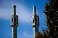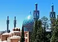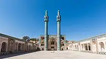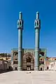 بر جلوخان دو مناره مرتفع دیده میشود که در زمان محمد شاه قاجار و پس از او ساخته شدهاند و از بلندترین منارههای مساجد ایران بهشمار میروند. سه حیاط و ساختمانهای اطراف شمای کلی آرامگاه را تشکیل میدهند. هر یک از حیاطها یک حوض و تعدادی درخت دارد.[1]