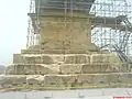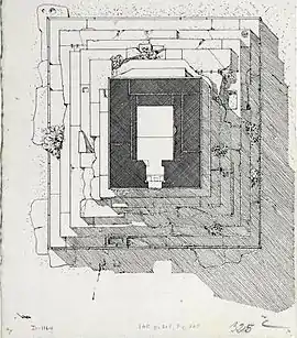 یک منطقهٔ وسیع که محدودهٔ آن به وسیلهٔ پایهٔ ۲۴ ستونِ گِرد مشخص شدهاست، ساختمان [آرامگاه] را به مانند یک مربع در میان گرفتهاست. قطر هر ستون ۳ پا و ۳ اینچ [تقریباًّ ۹۹ سانتیمتر] است. هر ضلع مربع توسط ۶ ستون کامل میشود که فاصلهٔ هر ستون از ستون کناریاش ۱۴ پا [تقریباً ۴٬۲۷ متر] است. ۱۷ ستون هنوز ایستاده هستند، ولی دور و برشان انباشته از آشغال است، و خامدستانه توسط دیواری گِلی به هم وصل شدهاند.