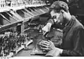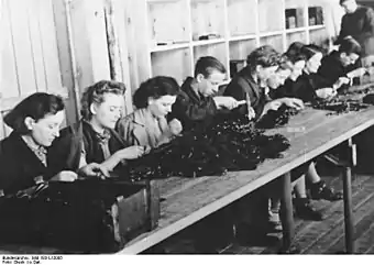![]() کارگران اجباری اغلب زن در حال کار در کارخانه آلمانی ساخت مهمات جنگی در لهستان اشغالی. تخمین زده میشود که ۲٬۵۰۰ کارخانه آلمانی در طی جنگ اقدام به استخدام کارگران اجباری کردهاند.[1] | |