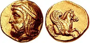 ![]() پرتره آرتاباز دوم، از سکه طلای وی (۳۸۹–۳۲۸ پیش از میلاد). | |