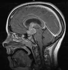 یک تصویر ساژیتال از مغز. قدرت تفکیک پایین تصویر بدلیل آرتیفکت حرکتی است.