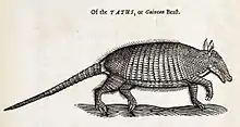 1658 woodcut of an armadillo- آرمادیلوی نهنواره or long-nosed armadillo, Dasypus novemcinctus