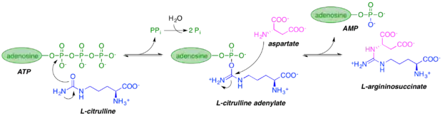 - Ghose C, Raushel FM (October 1985). "Determination of the mechanism of the argininosuccinate synthetase reaction by static and dynamic quench experiments". Biochemistry 24 (21): 5894–8.