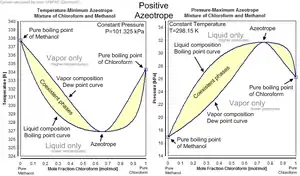 - انحراف مثبت: در این حالت نمودار فشار-کسر مولی دارای ماکسیمم و نمودار دما-کسر مولی دارای مینیمم است. این حالت نشانگر غلبه نیروهای بین مولکولهای مشابه بر نیروی بین مولکولهای غیر مشابه است.