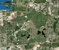 ![]() نمای ماهوارهای آزمایشگاه فرمی. سازههای مدور دو حلقه انژکتور اصلی (کوچکتر) و تواترون (بزرگتر) را نشان میدهد. | |