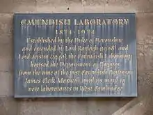 آزمایشگاه کاوندیش، گروه فیزیک در دانشگاه کمبریج است و نیز بخشی از دانشکده علوم فیزیکی دانشگاه است. این آزمایشگاه در سال ۱۸۷۴ به عنوان یک آزمایشگاه آموزشی تحت نظارت جیمز کلرک ماکسول، اولین استاد فیزیک آزمایشی، افتتاح شد.[1] تا آن زمان، فیزیک به معنای فیزیک نظری بود و به عنوان بخشی از ریاضیات در نظر گرفته می شد. ماکسول در سال ۱۸۷۹ در اوایل سن ۴۸ سالگی درگذشت و مدیریت آزمایشگاه به لرد ریلی سپرده شد که مسئول راه اندازی یک دوره نظام مند آموزشی در فیزیک تجربی بود. دوره ای که همچنان هسته اصلی برنامه های آموزشی آزمایشگاه باقیمانده است.[2]