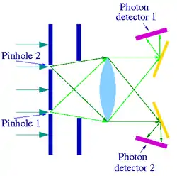 در این آزمایش، نور به صفحهای که شکاف یا سوراخ ریزی روی آن قرار دارد، تابانده میشود. در مقابل این صفحه، صفحه دیگری قرار دارد که بر روی آن دو سوراخ ریز ایجاد شدهاست. نوری که از شکاف اول عبور میکند به این دو شکاف تابانده میشود و پس از خروج از این دو شکاف به صورت دو پرتو بر روی یک صفحه عکاسی که در فاصله معینی در برابر صفحه دوم قرار دارد، میافتد. از آنجا که نور به صورت موج عمل میکند این دو پرتو نور بر روی صفحه با یکدیگر برخورد کرده و پدیدهٔ تداخل رخ میدهد. اگر پرتوهای تابانده شده در حالی که هر دو در نقطه حداکثر یا حداقل خود قرار دارند با یکدیگر تلاقی کنند، نقطهای نورانیتر روی صفحه عکاسی ظاهر میشود و اگر دو پرتو در حالتی متفاوت با یکدیگر تلاقی کنند، اثر یکدیگر را خنثی کرده و به صورت نقطهای تاریک بر روی صفحه ظاهر میشوند. تعدادی سیمهای نازک درست در جایی که باید فریزهای تاریک از الگوی تداخلی وجود داشته باشند، قرار داده میشوند. سپس یکی از روزنهها بسته میشوند در این حالت از تشکیل الگوی تداخلی جلوگیری میشود و نور به راحتی همزمان با خروج از یک روزنه تکی، منتشر میشود، به این ترتیب بخشی از نور که به سیمهای فلزی برخورد میکند در تمام راستاها متفرق میکند و اینکه نور به آشکارساز فوتونهای مربوط به آن روزنه برسد بی مفهوم میشود، اما هنگامی که روزنه بسته، کامل باز شد، شدت نور در هر آشکارساز به مقدار اولیه (زمانی که سیمها در محل قرار داده نشده بودند) بازمیگردد چون سیمها در فریزهای تاریک از الگوی تداخلی قرار دارند که نور حاصل از دو شکاف یکدیگر را خنثی میکنند و در نتیجه هیچ نوری به آنها برخورد نکرده و بنابراین هیچیک از فوتونها منتشر نمیشوند. این نتیجه حاصل وجود الگوی تداخلی یعنی حالتی است که شکل موجی نور نمود مییابد، در حالی که میتوان شدت نور خارج شده از هر شکاف را نیز با یک آشکارساز فوتون اندازهگیری کرد و تعداد فوتون عبوری از میان هر شکاف را تعیین کرد. این آزمایش مدعی بطلان اصل مکملیت است،[1] حالآنکه برخی از فیزیکدانها هرگز نتایج آن را نپذیرفتهاند.[2]