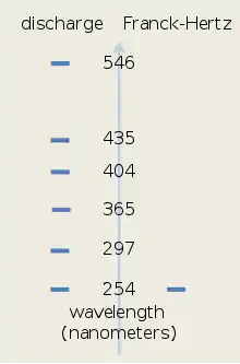فرانک و هرتز در مقالهٔ اولشان به این نکته اشاره کردند که انرژی مشخصه ۴.۹ الکترون ولت در آزمایش آنها متناسب با یکی از طول موجهای نور منتشر شده از اتمهای جیوه هنگام تخلیهٔ الکتریکی گاز جیوه است. در آن زمان، آنها از رابطه کوانتومی بین انرژی برانگیختگی و طول موج نور منتشر شده که توسط یوهانس اشتارک و آرنولد زومرفلد منتشر شده بود، استفاده کردند. این رابطه پیشبینی میکرد که انرژی ۴.۹ الکترون ولت متناسب با نوری با طول موج ۲۵۴ نانومتر است. رابطهٔ مشابهی نیز پیشتر توسط اینشتین در سال ۱۹۰۵ در توجیه اثر فوتوالکتریک استفاده شده بود.[6] فرانک و هرتز در مقالهٔ دوم به نشر نوری لامپ خلأ اشاره کردند. این نور دارای طول موج ۲۵۴ نانومتر بود.[4] در حالیکه همانطور که تصویر سمت چپ نشان میدهد، نور حاصل از تخلیۀ الکتریکی گاز جیوه دارای چندین طول موج در اطراف ۲۵۴ نانومتر است. این تصویر براساس طیف اولیهای است که فرانک و هرتز در سال ۱۹۱۴ منتشر کردند. این واقعیت که لامپ فرانک-هرتز به صورت تک طول موج بوده و این طول موج دقیقاً متناسب با بازۀ ولتاژی بود که آنها اندازهگیری کرده بودند، نکتۀ بسیار مهمی بود.[7]