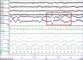 ![]() Polysomnographic record of حرکت تند چشم در خواب sleep. Eye movements highlighted by red rectangle. | |