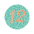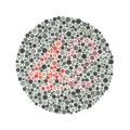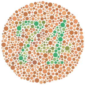 ![]() نمونهای از یکی از صفحات آزمون رنگ ایشیهارا. عدد «74» باید برای کسانی که دید سالمی دارند، به وضوح مشخص باشد. افراد دورنگبین یا سهرنگبین غیرعادی ممکن است عدد را «21» ببیند و کسانی کهابیراهی رنگی دارند، ممکن است عددی نبینند. | |