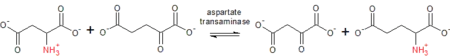 Aspartate (Asp) + α-ketoglutarate ↔ oxaloacetate + glutamate (Glu)