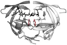 ![]() ساختار آسپارتیک پروتئاز دایمریک پروتئاز اچآیوی به رنگ سفید و خاکستری، سوبسترای پپتید به رنگ سیاه و جایگاه فعال رنجیرهٔ جانبی آسپارتات به رنگ قرمز نمایش داده شدهاست. (پیدیبی 1KJF) | |||||||||
