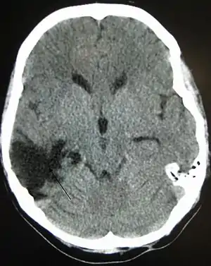 | تصویر سیتی از یک سر که چندین سال پیش دچار ضربه مغزی شدهاست و نشاندهنده یک فضای خالی در جایی که ضربه خوردهاست، میباشد. |