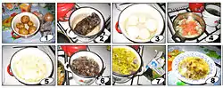 «پوره لوبیای قرمز، لوبیای سفید و بادام، نخود، دلمه نخود، مرغ آبپز، گوشت گوسفند آبپز، زبان آبپز و غیره.»