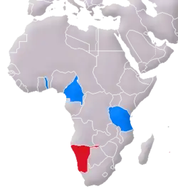 ![]() نقشهٔ مستعمرههای آلمان در آفریقا، آفریقای جنوب باختری با رنگ سرخ نشان داده شدهاست. | |||||||