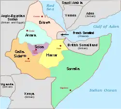 در اوت ۱۹۴۰ در طول جنگ جهانی دوم سومالی بریتانیا فتح و ضمیمه آفریقای شرقی ایتالیا شد، که خود در سال ۱۹۴۱ هنگام نبرد آفریقای شرقی که توسط نیروهای تحت رهبری بریتانیا که در برگیرنده نیروهای اتیوپیایی و مستعمره نشینان بود فتح شد.[2] در این زمان سومالی بریتانیا، سومالی و اریتره ایتالیا تحت حکومت بریتانیا درآمدند. به سال ۱۹۴۹ سومالیلند ایتالیا به کشور منطقه سومالیلند تغییر یافت که از سال ۱۹۵۰ تا ۱۹۶۰ توسط ایتالیا اداره میشد تا زمان استقلال آن در ۱۹۶۰. در سال ۱۹۵۱ اریتره ضمیمه اتیوپی شد.