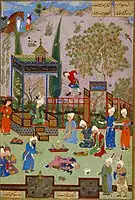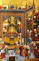 ![]() برگی از شاهنامه، فریدون در هیبت یک اژدها در مقابل سه فرزندش، منصوب به آقا میرک | |