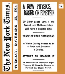 بر اساس محاسبات انجام شده توسط اینشتین دربارهٔ نظریه جدید نسبیت عام در سال ۱۹۱۱، نوری که از جانب ستارگان دیگر میآید، باید توسط خورشید خم میشود. در سال ۱۹۱۹، این پیشبینی توسط آرتور ادینگتون طی خورشیدگرفتگی ۲۹ مه ۱۹۱۹ تأیید شد. این مشاهدات در رسانههای بینالمللی منتشر شدند و این موجب شهرت جهانی اینشتین شد. در ۷ نوامبر ۱۹۱۹، روزنامه مطرح بریتانیایی تایمز، یک تیتر اصلی با این عنوان منتشر کرد: «انقلابی در علم - نظریه جدید کیهان - ایدههای نیوتونی واژگون شدند.»[lower-alpha 31][55]