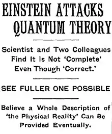 - Einstein, Albert; Podolsky, Boris; Rosen, Nathan (15 May 1935) [Received 25 March 1935]. "Can Quantum-Mechanical Description of Physical Reality Be Considered Complete?". Physical Review (Submitted manuscript). pp. 777–780. Bibcode:1935PhRv...47..777E. doi:10.1103/PhysRev.47.777 – via APS Journals.
