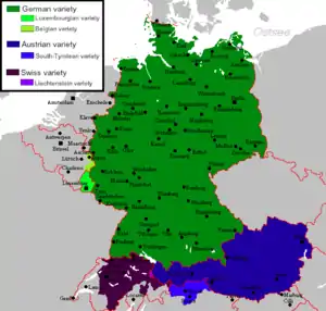 آلمانی بیشتر به عنوان یک زبان چندکانونی نامتوازن در نظر گرفته میشود؛ زبان معیار آلمان، بیشتر به دلیل تعداد بیشتر گویشوران و عدم آگاهی مردم از وجود گونههای معیار اتریشی و معیار سوئیسی، در بیشتر موارد غالب است. اگرچه تلفظهای یکسانی بر اساس کتاب راهنمای تئودور سیبس وجود دارد که امروزه از آن در تئاتر و به میزان کمتری در اخبار رادیو و تلویزیون در سراسر کشورهای آلمانیزبان استفاده میشود، اما این برای گونههای معیار رایج در اتریش، تیرول جنوبی و سوئیس، که در تلفظ، واژگان و حتی گاهی دستور زبان با آلمان متفاوت هستند، صدق نمیکند. در سوئیس حرف ß از الفبا حذف شده و ss جایگزین آن شدهاست. حتی گاهی اوقات این امر در پخش اخبار در باواریا (یک ایالت آلمان با هویت فرهنگی جداگانه قوی) نیز یافت میشود. گونههای آلمانی معیار رایج در این مناطق در سنتهای فرهنگی خاص (به عنوان مثال در واژگان آشپزی، که بهطور قابل توجهی در مناطق آلمانیزبان اروپا متفاوت است) و اصطلاحات مختلفی که در قانون و حکومت استفاده میشود تا حدی تحت تأثیر گویشهای منطقه خود قرار گرفتهاند. مثلاً فهرستی از اصطلاحات اتریشی برای برخی از مواد غذایی حتی در قانون اتحادیه اروپا نیز گنجانده شدهاست، اگرچه کاملاً ناقص است.[2]