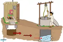 آلودگی آبهای زیرزمینی با عوامل بیماریزا و نیترات همچنین میتواند از مایعاتی که از سیستمهای بهداشتی محلی مانند توالت گودالی و مخازن سپتیک به داخل زمین نفوذ میکنند، رخ دهد که این امر تحت تأثیر میزان تراکم جمعیت و شرایط هیدروژئولوژیک نیز میباشد.[6]