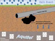 نگرانی فزاینده ای در مورد آلودگی آبهای زیرزمینی با بنزین نشت شده از مخازن ذخیره زیرزمینی نفتی (USTs) از پمپ بنزینها وجود دارد.[1] ترکیبات BTEX رایجترین مواد افزودنی بنزین میباشند. ترکیبات BTEX، از جمله بنزن، وزن مخصوص کمتری نسبت به آب (۱ گرم در میلی لیتر) دارند. شبیه به نشت نفت در دریا، فاز غیرقابل حل، که به آن مایع فاز غیر آبی سبک(LNAPL) گفته میشود، روی سطح ایستابی آب در سفره آب «شناور» خواهد شد.[1]