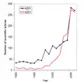 تعداد مقالات علمی ای که آلیاژهای AZ91 و AZ31 را در چکیدهٔ خود نام بردهاند.