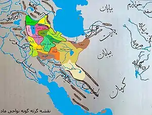 کلمه ماد، بزبان آشوری مادای، آمادای، ماتای و بزبان عیلامینو ماتاپه و بزبان یونانی قدیم مدی یکی از نامهای قومی و جغرافیایی است که ریشهٔ واضح از زبانهای ایرانی برای آن نمیتوان یافت.[7] معهذا در میان مردم آن سرزمین که در قرن نهم پ.م. به زبان ایرانی سخن میگفتند متداول بود و این خود از شکل دیگر کلمه یعنی آمادای که در ردیف مادای در منابع آشوری محفوظ مانده و مشهود است. در این صورت واژهسازی با پیشوند «آ» و بدون آن ویژهٔ زبانهای ایرانی است.[8]
