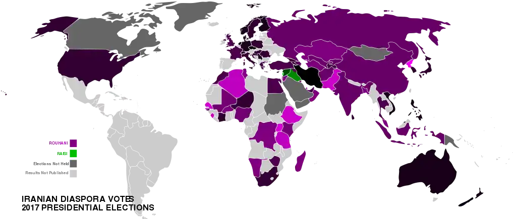 - «نتایج انتخابات ریاست جمهوری در خارج از کشور +فهرست کامل». مشرق. ۳۰ اردیبهشت ۱۳۹۶. بایگانیشده از اصلی در ۲۶ ژوئیه ۲۰۱۷. دریافتشده در ۴ مه ۲۰۲۰.