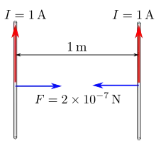 تعریف یک آمپر در سامانهٔ بینالمللی یکاها: اگر از دو سیم دراز و نازک که به فاصله یک متری بهطور موازی از هم در خلأ قرار گرفته باشند و جریانهای مساوی در یک جهت از سیمها عبور کند به گونهای که بر یک متر از طول یکی از سیمها نیرویی برابر نیوتن وارد شود جریانی که از هر یک از سیمها میگذرد، (یک آمپر) است.