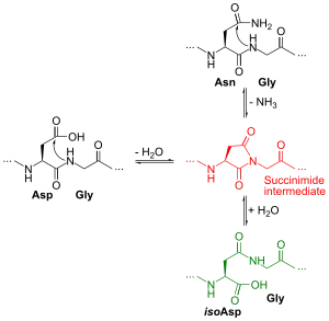 واکنش آمیدزدایی Asn-Gly (بالا سمت راست) به Asp-Gly (در سمت چپ) یا iso(Asp)-Gly (به رنگ سبز در پایین سمت راست).