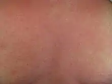 علائم معمولاً شامل برآمدگیهایی روی پوست (کهیر)، خارش، صورت و پوست سرخ (برافروختگی)، یا لبهای متورم است.[6] افرادی که دچار ورم زیر پوستی (آنژیوادم) شدهاند، ممکن است به جای خارش احساس سوختگی داشته باشند.[5] تا ۲۰٪ موارد ممکن است زبان یا حلق فرد متورم شود.[7] دیگر علائم شامل آبریزش بینی و تورم غشای مخاطی روی سطح چشم و پلک (کونژنکتیویت) است.[8] پوست ممکن است به دلیل کمبود اکسیژن به رنگ آبی دربیاید (سیانوز).[8]