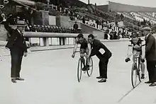 ![]() Antoine Mazairac (left) at the 1928 Olympic Games in Amsterdam in the sprint semi-final against the Danes Willy Falck Hansen. | |||||||||||||