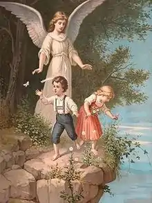 ![]() فرشته نگهبان درحال محافظت کودکان، چاپ قرن نوزدهم | |