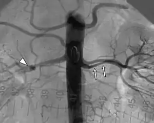 | پیکان مثلثی شکل یک آنوریسم را در سرخرگ کلیوی راست نشان میدهد. | |